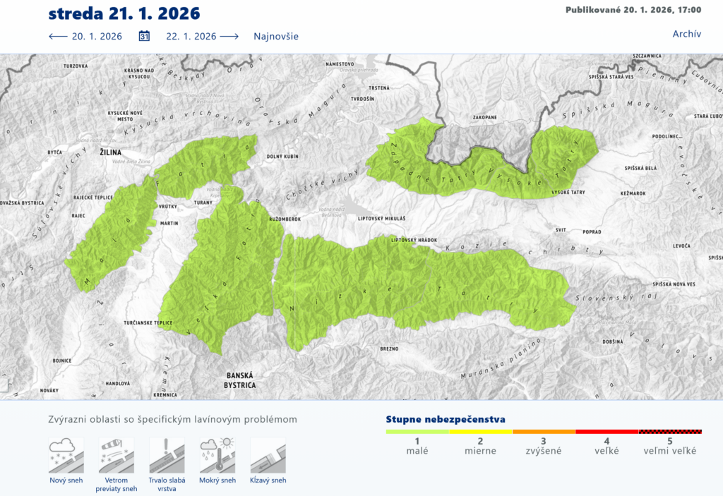 Spomenutý charakter počasia mal vplyv aj na snehovú pokrývku a na lavínovú situáciu. Na južných, slnkom osvietených svahoch sa neustálym natápaním a zamŕzaním na povrchu vytvorila kôra rôznej hrúbky a tvrdosti – väčšinou sa prebárala – čo značne zhoršilo podmienky na chôdzu a na lyžovanie. Silný južný vietor premiestňoval všetok voľný sneh na severné (SZ) svahy, kde vytvoril lokálne nestabilné snehové dosky a vankúše. Tie sa však postupne menili na tvrdý, vetrom ufúkaný sneh ktorý sa postupne stabilizoval. Lavínová situácia korešpondovala so snehovou pokrývkou, spočiatku trvalo v najvyšších polohách Tatier a Nízkych Tatier (nad 1700m) MIERNE lavínové nebezpečenstvo 2.stupeň. Od stredy 21.1 už bolo vo všetkých polohách a vo všetkých pohoriach len MALÉ lavínové nebezpečenstvo 1.stupeň. Snehová pokrývka je sadnutá, stabilizovaná a spevnená a v neposlednom rade výrazne podpriemerná. Jej výška dosahuje väčšinou len 20 – 80 cm, v žľaboch a pod skalnými stenami je lokálne 1 až 2 m, no na vetrom exponovaných miestach, na hrebeňoch a chrbtoch takmer úplne absentuje.