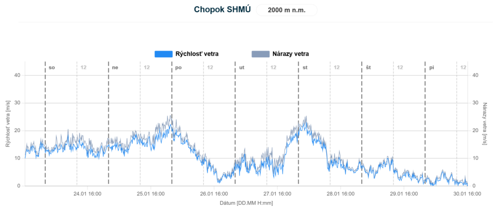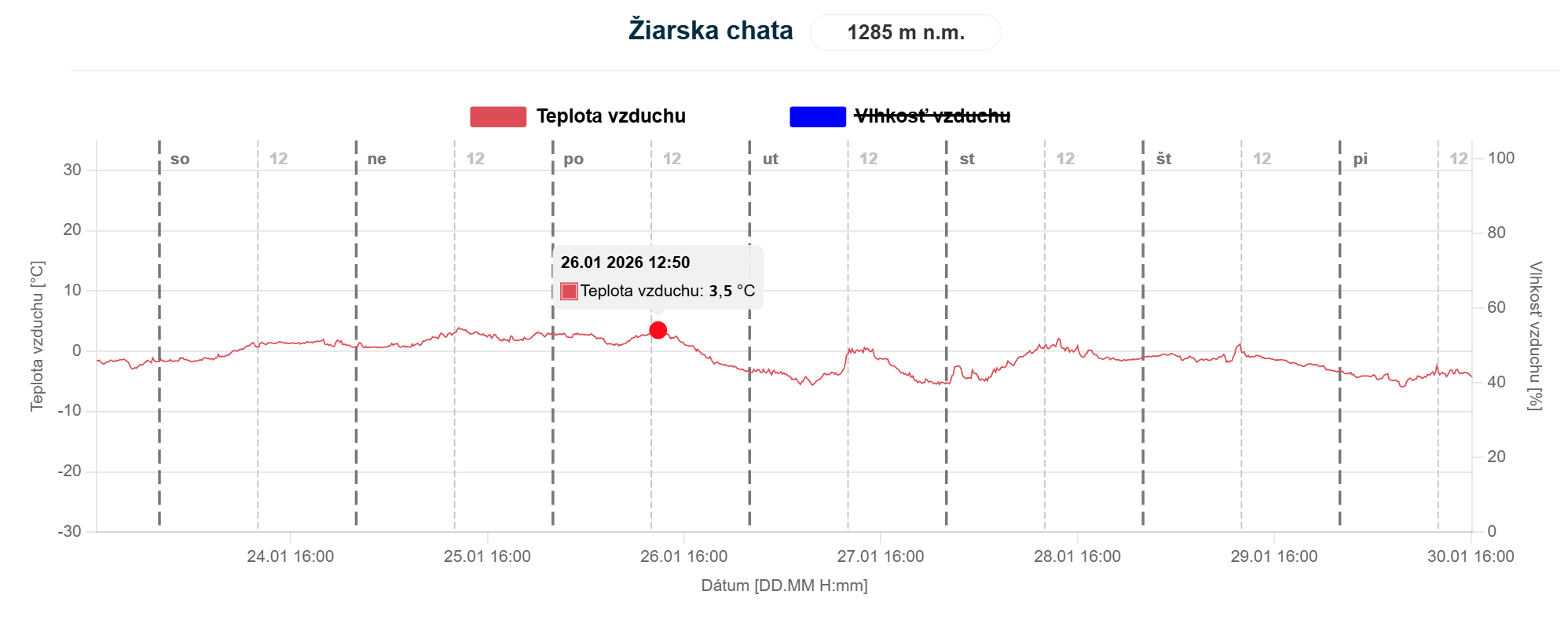 V pondelok 26.1.2026 doznievalo víkendové oteplenie. Naše horské oblasti boli pod vplyvom silného južného prúdenia. Teplo bolo hlavne na záveternej strane Nízkych Tatier. Napríklad, teplota na Žiarskej chate vo výške cca 1300 m n. m. dosiahla až +3,2 °C. Nulová izoterma dosiahla až hranicu okolo 1600 m n. m. Silné južné prúdenie bolo spojené s vetrom o sile víchrice. Objavili sa aj zrážky, najviac spadlo v Nízkych Tatrách (okolo 20 mm). Väčšinou šlo ale o mokrý sneh alebo dážď. Snehová pokrývka teda stúpla iba o cca 10 cm. V ďalších dňoch sa ochladzovalo.