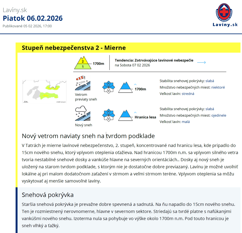 V ten deň bol vo Vysokých Tatrách vyhlásený 2. stupeň lavínového nebezpečenstva. Hlavným lavínovým problémom bol vetrom previaty sneh nad hranicou 1700m n.m. koncentrovaný prevažne do SZ až SV orientácií. Za poslednú periódu nie veľmi výrazného sneženia napadlo hlavne vo vysokých polohách Tatier od 10 do 15cm nového snehu. Ten bol vplyvom južného vetra navievaný na spomenuté orientácie. Vytvorené snehové dosky a vankúše o hrúbke aj viac ako 20cm ležali na starom tvrdom, miestami až ľadovom podklade. Za pomerne krátke časové obdobie, 3 dni, sa nepredpokladá, že budú s týmto podkladom previazané. Podľa lavínovej informácie, Lavínu je možné uvoľniť lokálne aj pri malom dodatočnom zaťažení v strmom a veľmi strmom teréne.