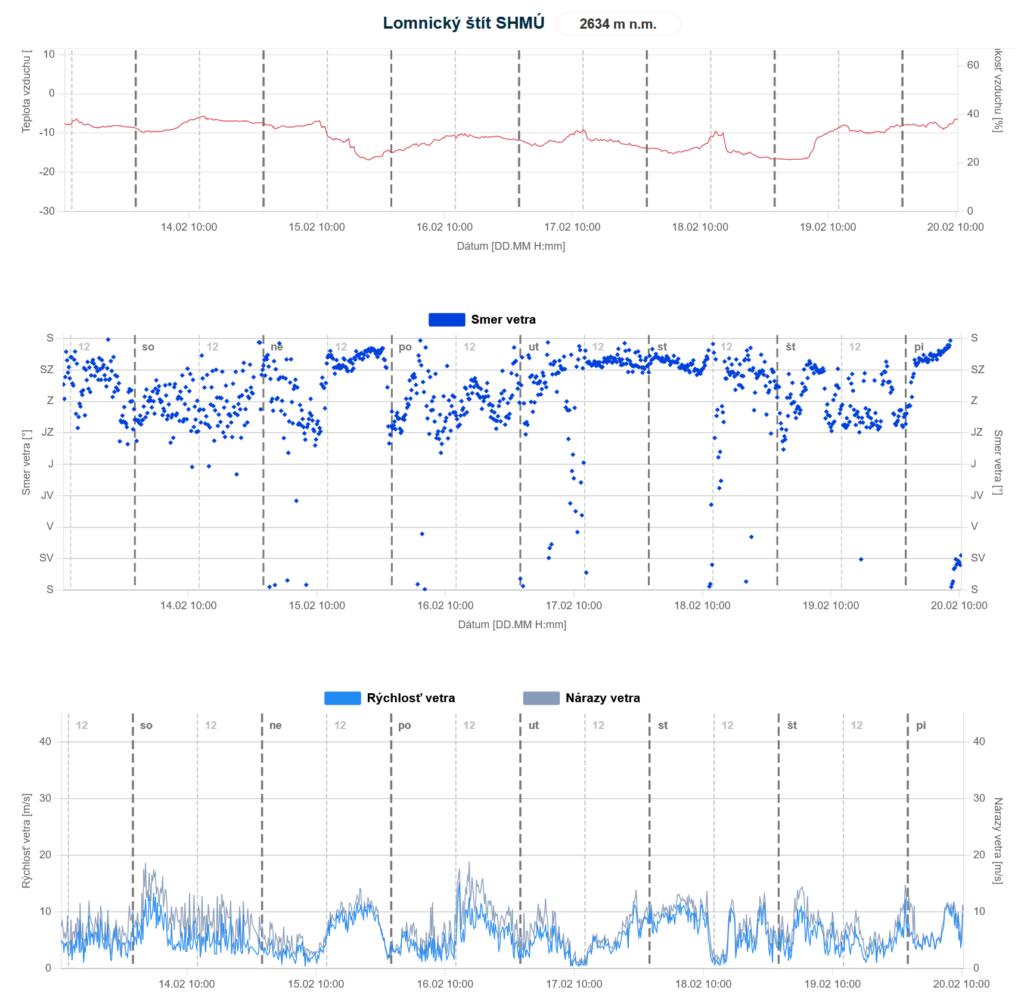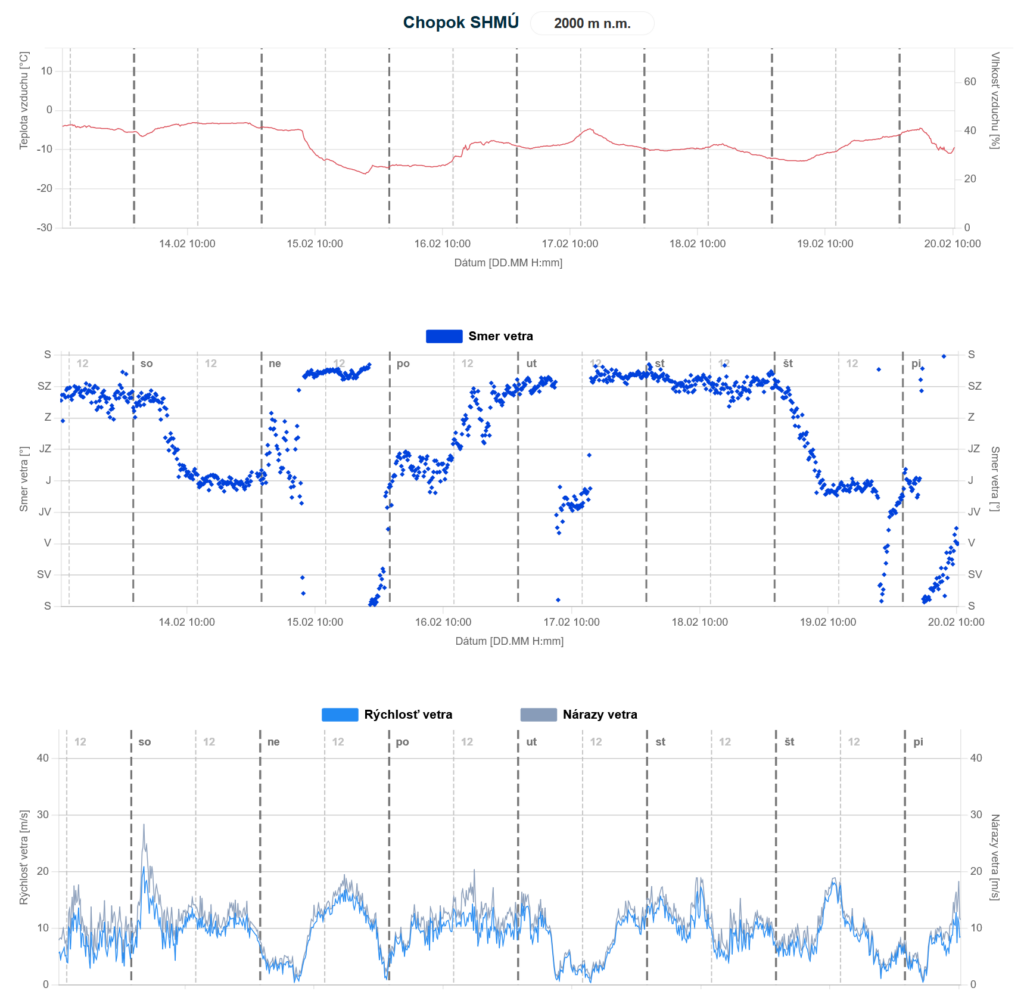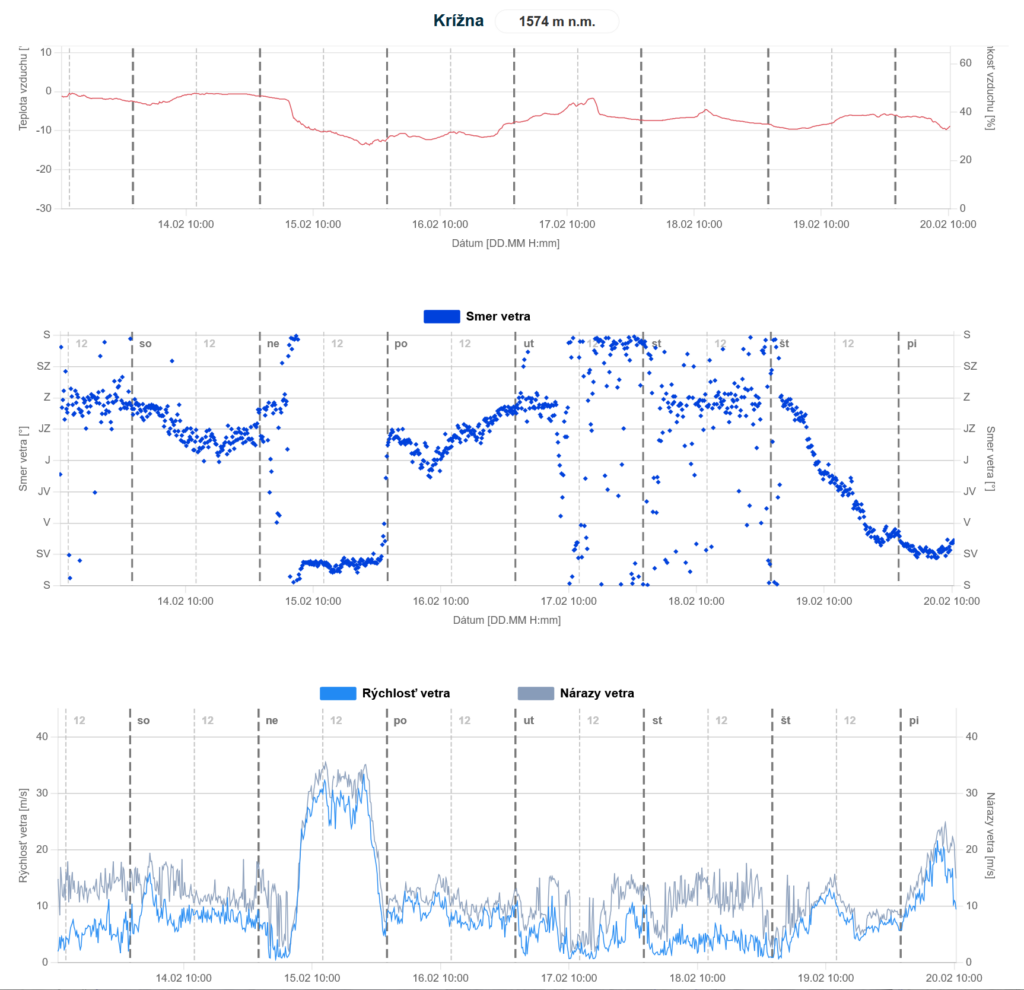 V sobotu 14.2 na Valentína vrcholilo teplé južné prúdenie, ktoré prinieslo zrážky, do výšky1400 – 1500 m vo forme dažďa. Nad touto hranicou pripadlo 10-15 cm nového snehu. V noci 14/15. feb prešiel Slovenskom intenzívny studený front, po ktorom sa ochladilo o viac ako 10°C. Hranica sneženia klesla až do kotlín a nížin. Zároveň sa zmenil vietor na severný a extrémne zosilnel. Na hrebeňoch (predovšetkým Veľkej Fatry) dosahovala rýchlosť vetra 30 až 35 m/s, čo znamená silu Orkánu. Na nasledujúcich grafoch jasne vidieť prechody frontov v podobe ochladenia, oteplenia, zmeny smeru a sily vetra: