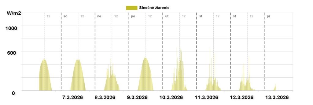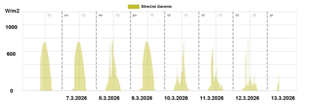 Cez víkend a do polovice týždňa pretrvávala typická jarná situácia, kedy snehová pokrývka cez noc stuhla vplyvom nízkych teplôt. Cez deň jarné marcové slnko, ktorého uhol dopadu lúčov je už priamejší snehovú pokrývku usilovne natápal a prerábal na firn. V grafoch nižšie je dobre vidieť globálne slnečné žiarenie počas začiatku marca aj na S sektoroch už dosahuje 600 W na m2.